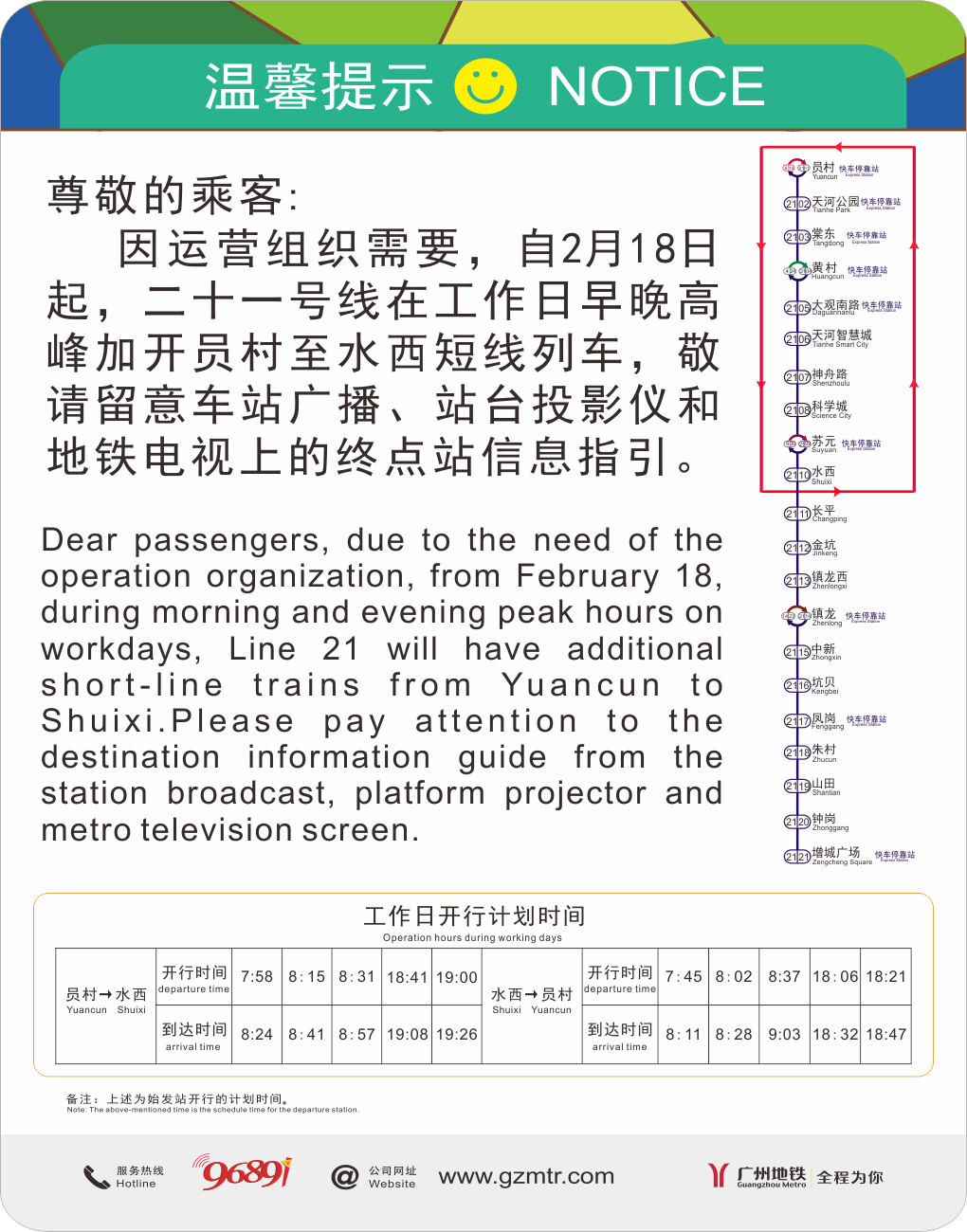 从2月18日(年初七)起,广州地铁二十一号线工作日晚高峰时段新增员村至水西“站站停”的短线列车。同时,快车时刻表也进行了调整。