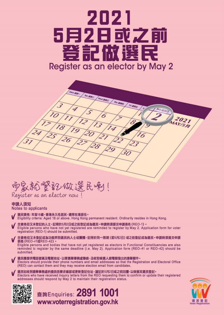 選舉事務處鼓勵持有身分證明文件、年滿18歲、通常在香港居住而未登記成為選民的香港永久性居民,在5月2日的法定限期前使用指定表格提交新登記申請,以便納入7月發表的正式選民登記冊內,並於選舉(包括今年舉行的立法會換屆選舉)中投票。市民申請登記為地方選區選民時,會同時成為區議會(第二)功能界別(俗稱「超級區議會」)的選民。