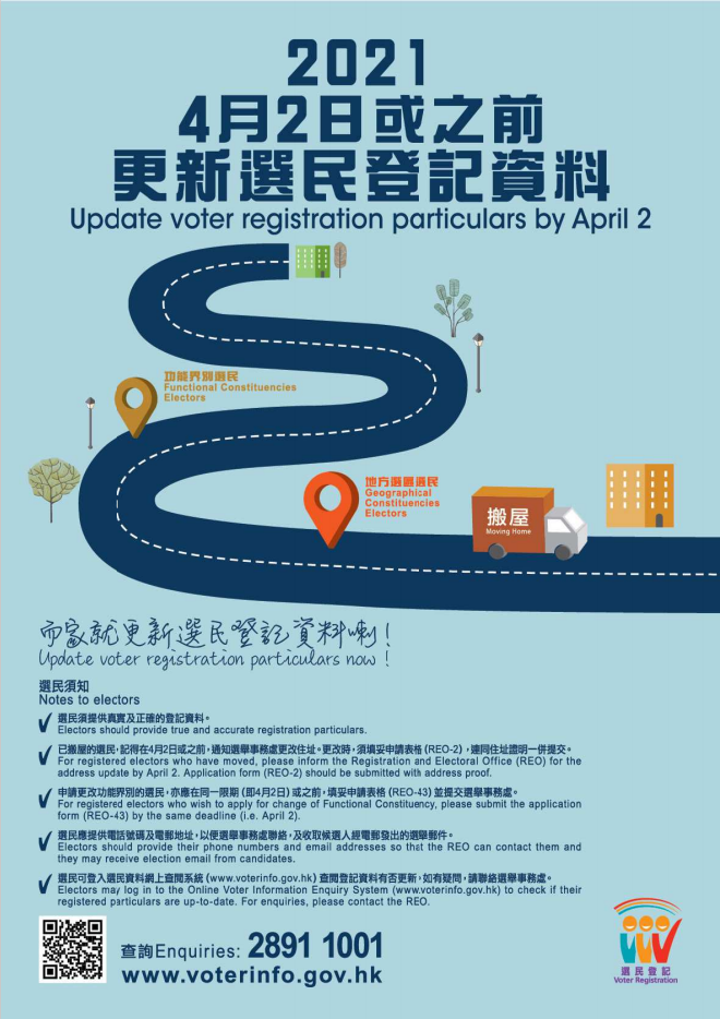 選舉事務處呼籲市民儘早遞交更改登記資料或新登記的申請。如有查詢,請致電選舉事務處熱線2891 1001。