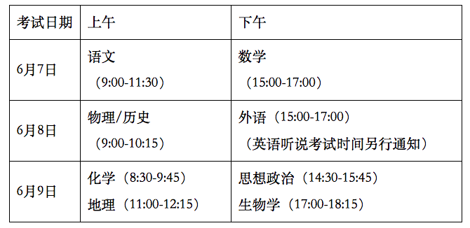 具体科目考试时间安排为:6月7日9:00至11:30语文;15:00至17:00数学。6月8日9:00至11:30文科综合/理科综合;15:00至17:00外语,有外语听力测试内容的应安排在外语笔试考试开始前进行。
