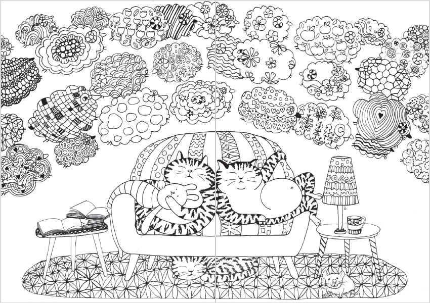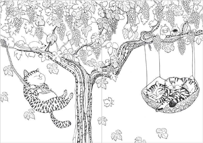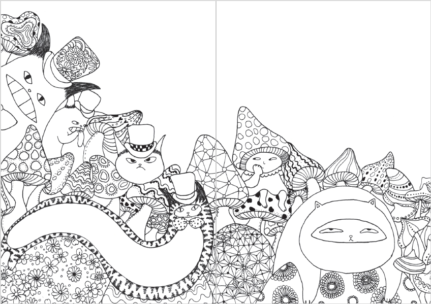本书的主体涂色部分,来自英籍亚裔青年插画家——露露·梅奥的构思,以形态各异的猫猫作为主角,描绘了一个奇幻世界,书中的猫猫也会挤公交车、蹬自行车、吹笛子、装高冷、开热趴。与现代都市人无异的生活日常,让人忍俊不禁。