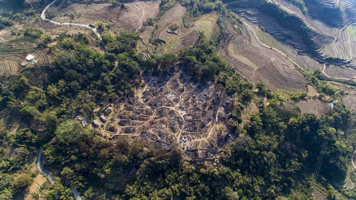 从空中俯瞰,云南省临沧市沧源佤族自治县翁丁村老寨严重受损。(无人机照片,新华社记者江文耀摄)