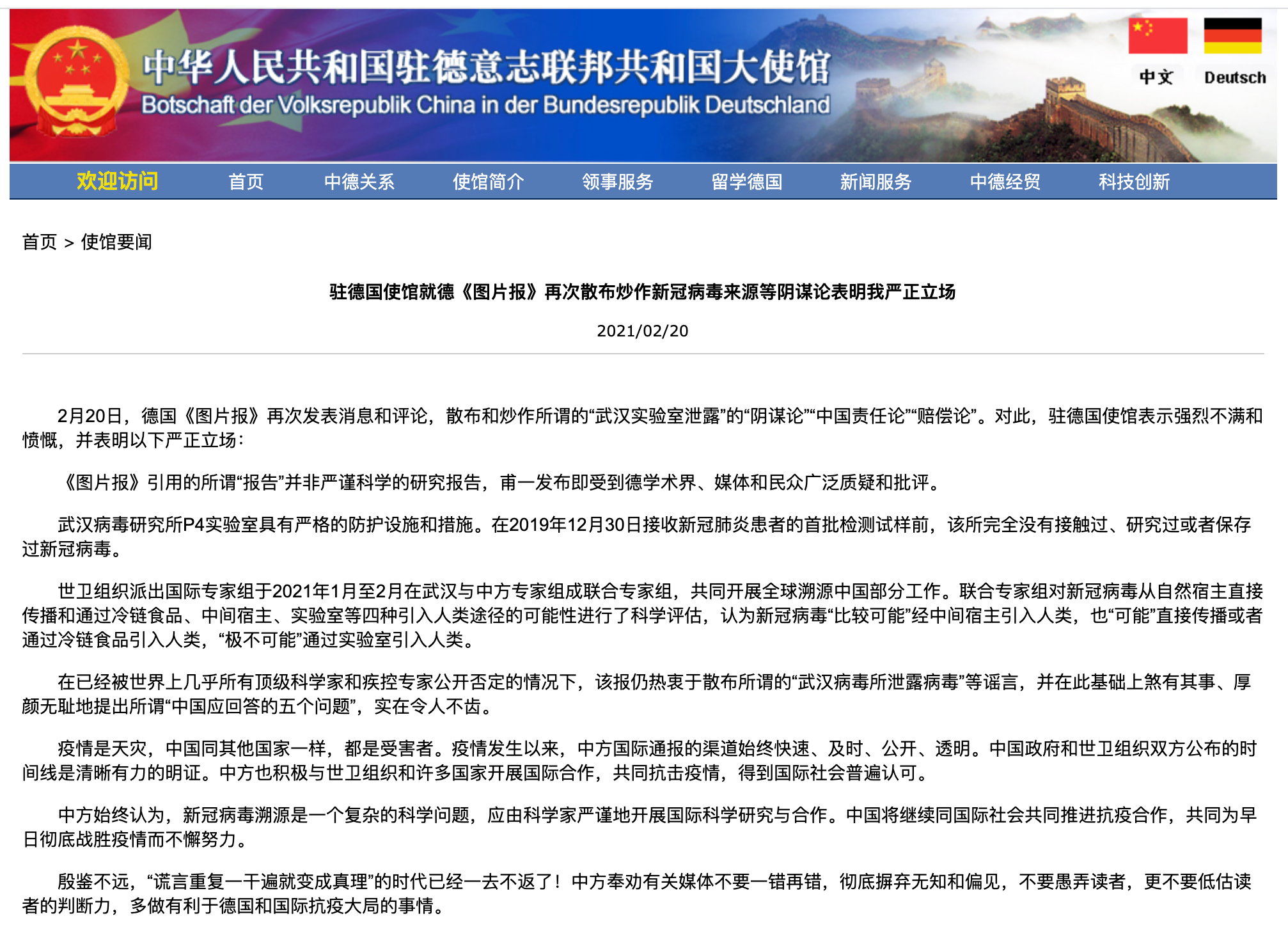 2月20日,德国《图片报》再次发表消息和评论,散布和炒作所谓的“武汉实验室泄露”的“阴谋论”“中国责任论”“赔偿论”。对此,驻德国使馆表示强烈不满和愤慨,并表明以下严正立场: