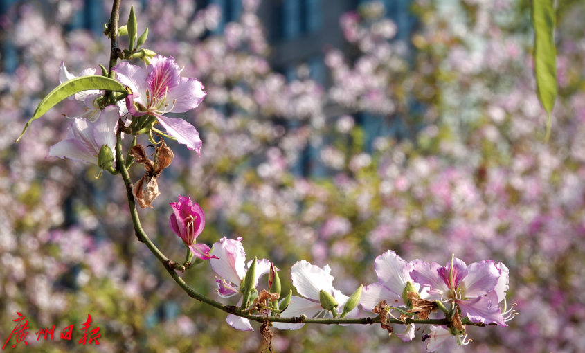 在广州,不少路段沿路均有种植宫粉紫荆,开花时总是吸引众多市民前来观赏,深受大家喜爱。可以想见,数米高的宫粉紫荆进入花期,粉、红、白花蕊竞相开放,争芳斗艳,成为城里的一道靓丽风景线。其实,不止人民北路、流花路、云城西路、云城东路,在麓湖路、临江大道、阅江路、白云路等路段,都能看到宫粉紫荆的身影。在广园快速路沙河立交(禺东西路)至黄村立交(茅岗)段人行道外侧绿化带,种植的紫荆花成排成片。
