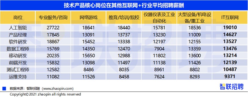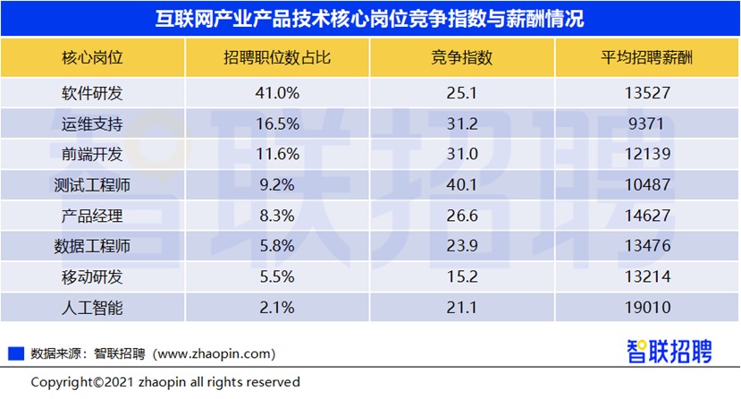 22日,招聘网站(智联招聘)发布《2021年互联网产业求职指南》显示,互联网产业整体产品技术核心岗位竞争激烈、且薪酬水平较高,其中人工智能岗位处于竞争热度低、招聘薪筹高的态势,平均薪酬达19010元/月。互联网技术人才正在传统行业渗透,其中工业互联网呈现井喷式发展,令制造业对互联网人才的需求只增不减。