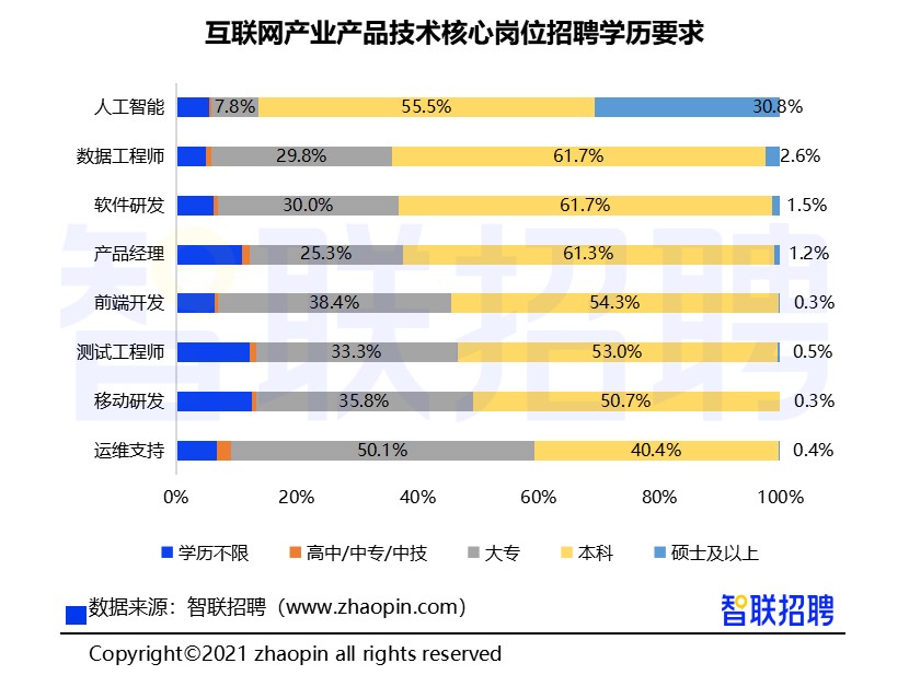从企业招聘对学历的要求看,互联网产业产品技术核心岗位的招聘需求中,55.8%的求职门槛为本科,其次是占比34%的大专,要求候选人学历达到硕士或以上的占比1.7%。