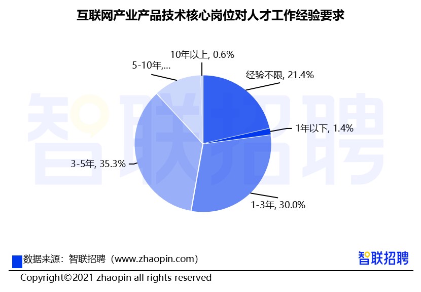 经验要求上,互联网产业产品技术核心岗位对于经验在“3-5年”需求最高,达到35.3%,其次是1-3年经验的求职者,占比3成。此外,表示“经验不限”的招聘需求超过2成,可见企业为不错过优秀技术人才,甄选过程更加灵活,进一步放开了硬性的经验制约。
