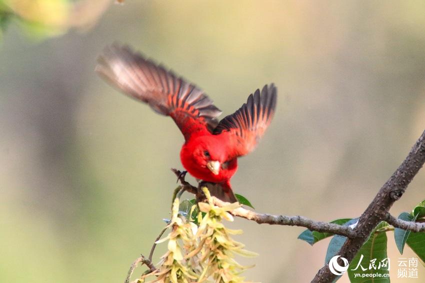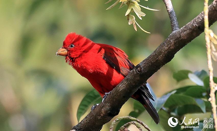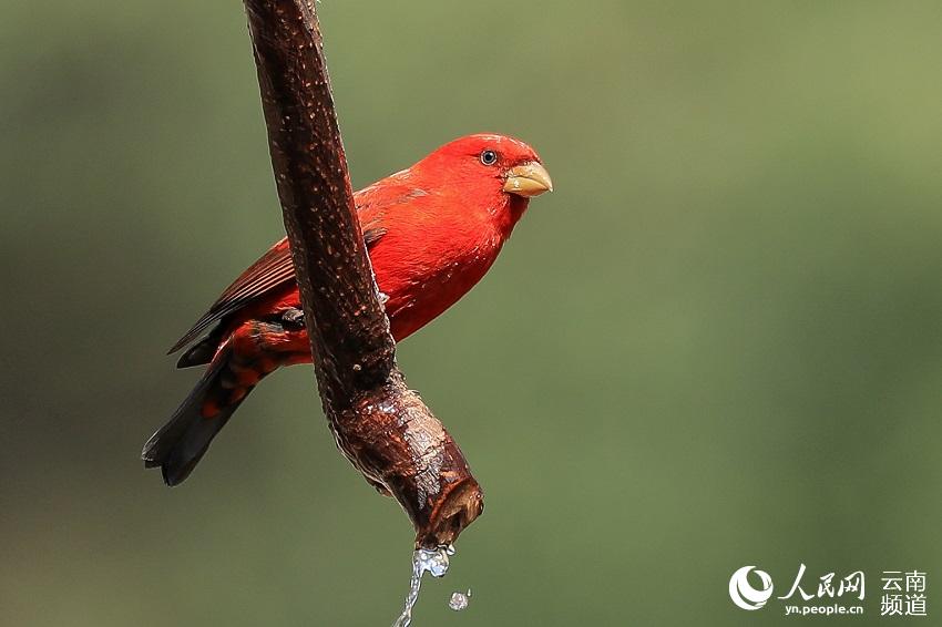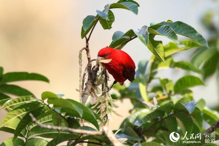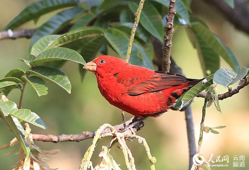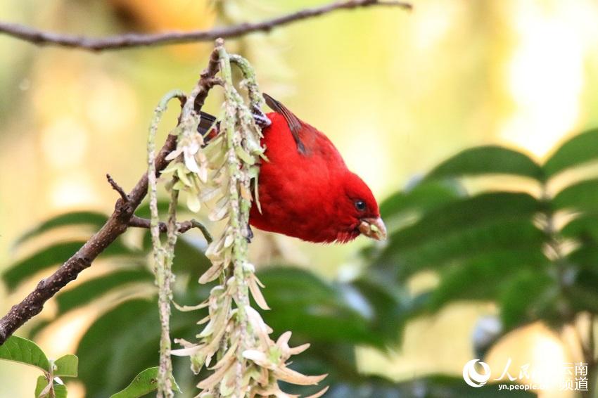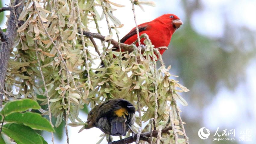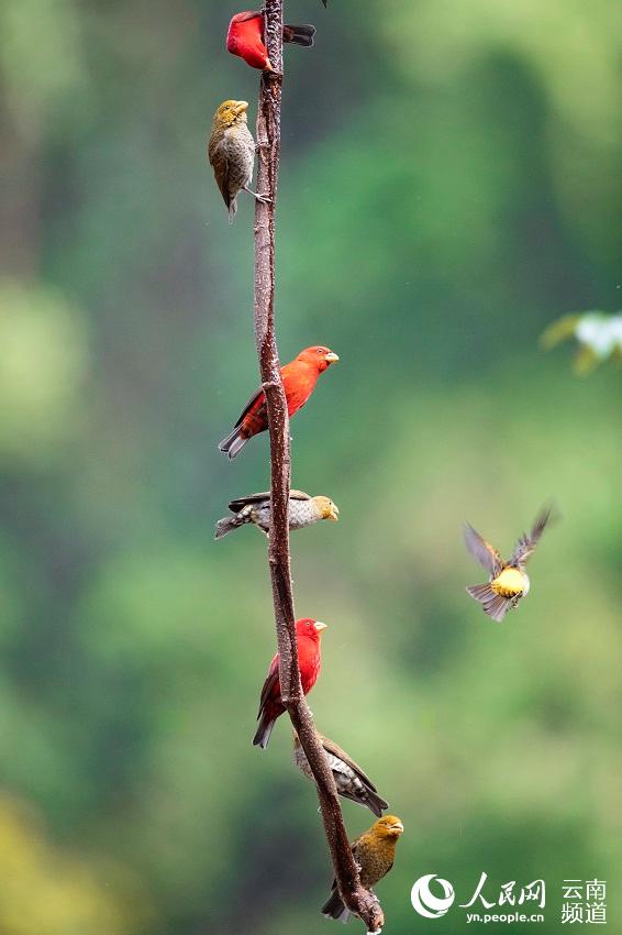 近日,云南保山高黎贡山百花岭村一村民惊喜地发现,有30多只血雀聚集在一棵黄杞树上觅食。(图片来源:人民网)