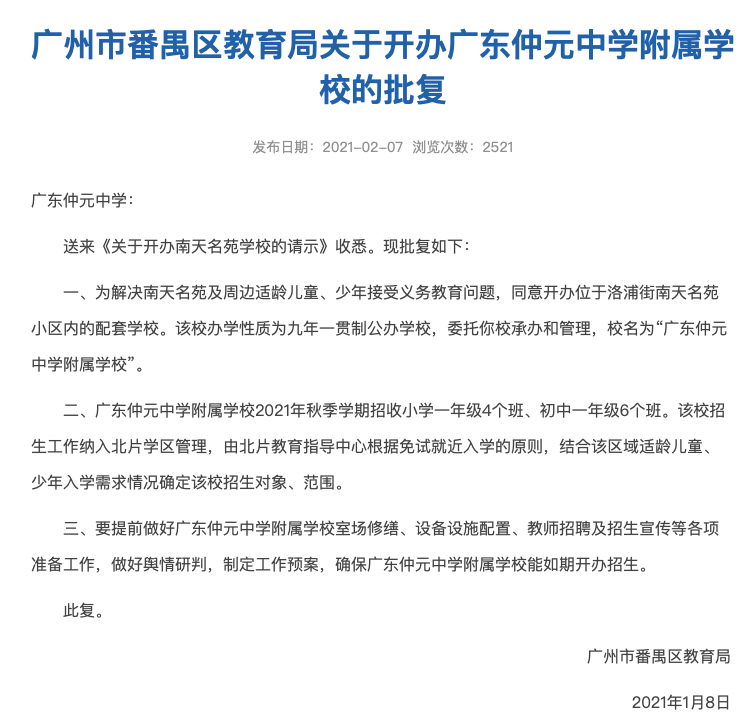 为解决南天名苑及周边适龄儿童、少年接受义务教育问题,番禺区教育局同意开办位于洛浦街南天名苑小区内的配套学校。该校办学性质为九年一贯制公办学校,委托广东仲元中学承办和管理,校名为“广东仲元中学附属学校”。