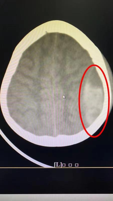 红圈内所示便是女童颅内左颞顶部硬膜外的大块血肿。