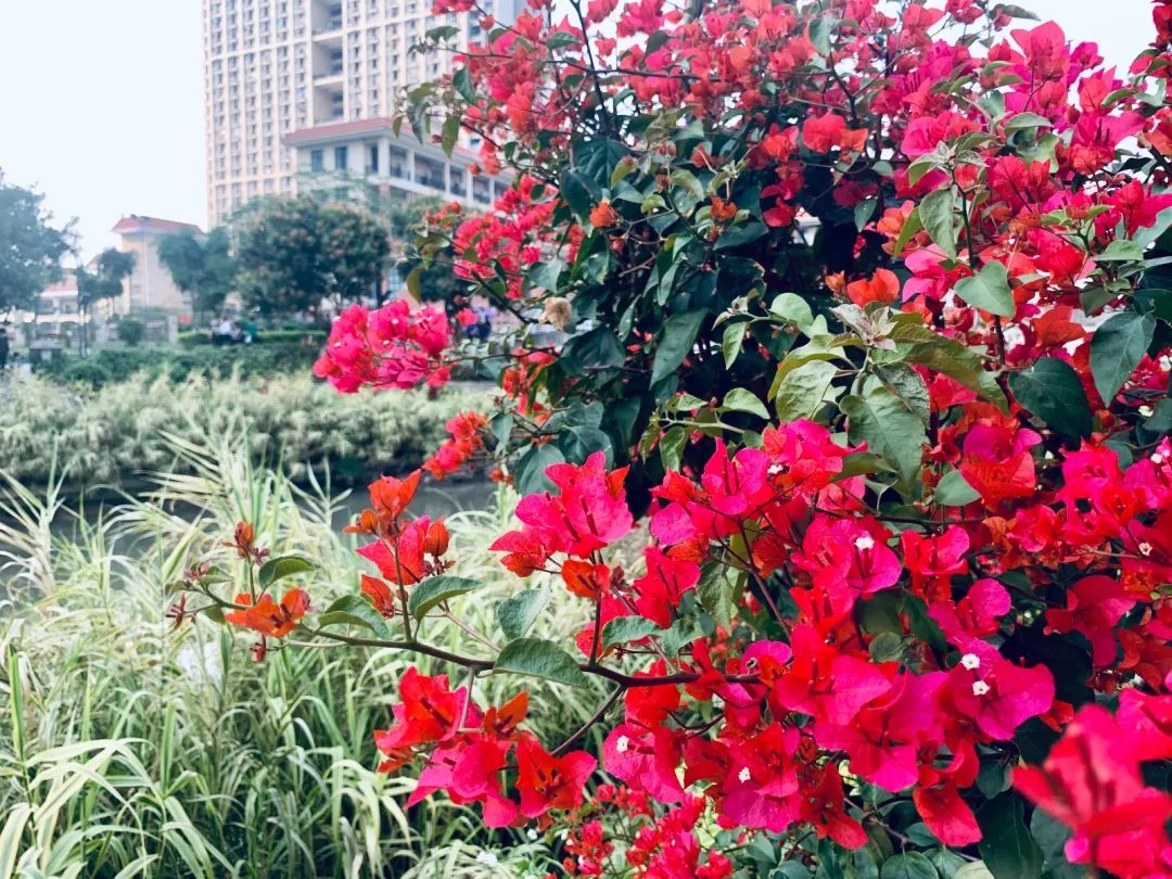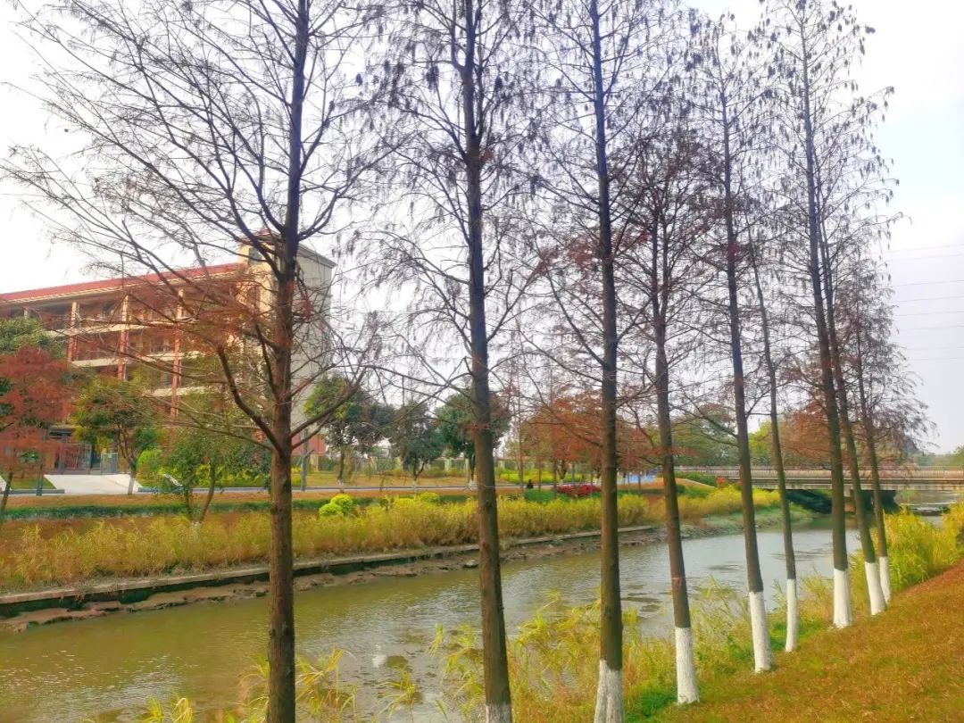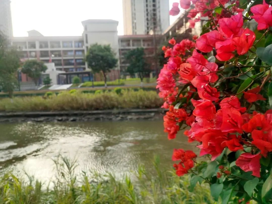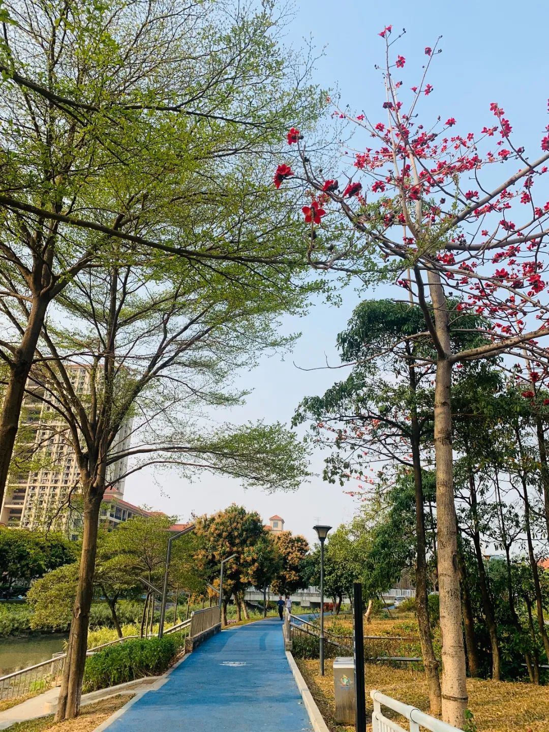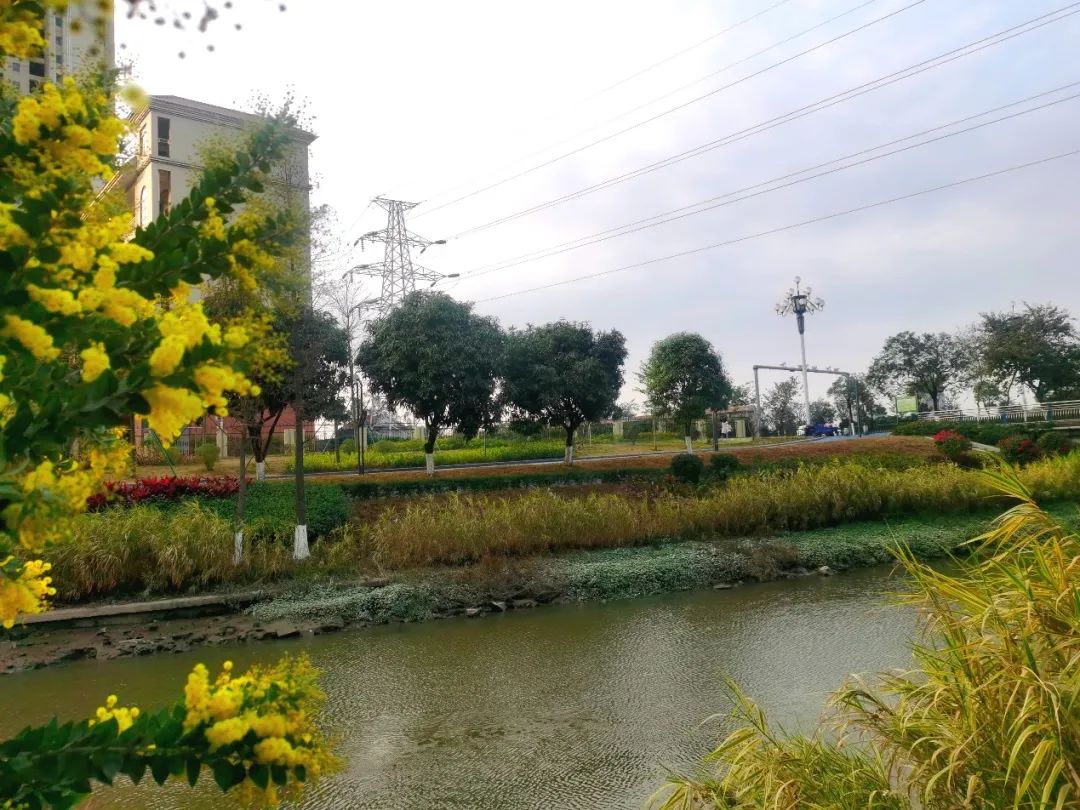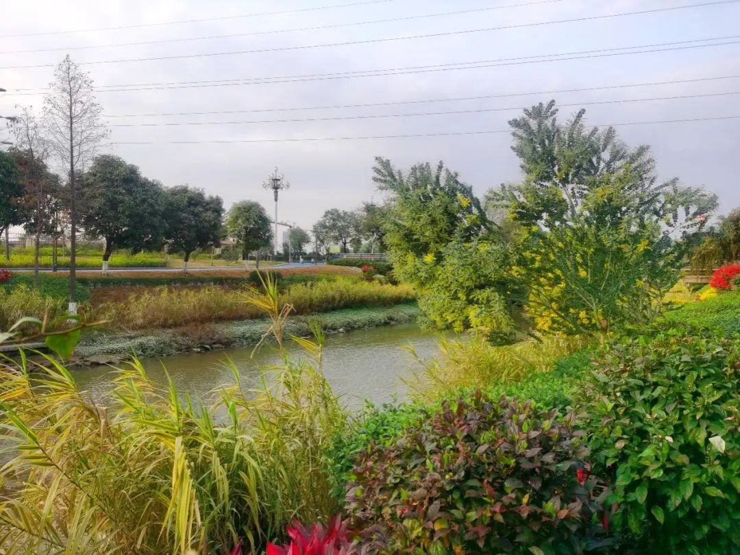 清风吹拂,悠悠碧波,夕阳映衬着水杉的倒影,一同印盖在河涌上。万花丛中过,多是淡紫簇簇的马缨丹,或有东风香吐的珍珠金合欢,或有英姿飒爽的红千层,婀娜多姿且争奇斗艳。