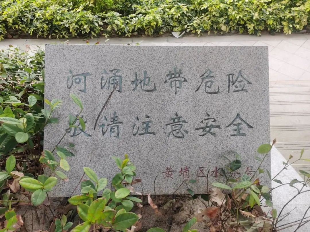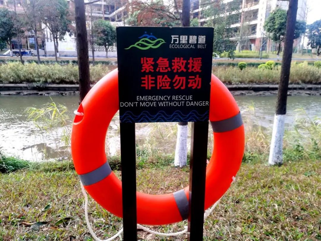 图说:碧道旁,放有救生圈设备与提示语。碧道部分地段位于河涌地带,敬请注意安全。