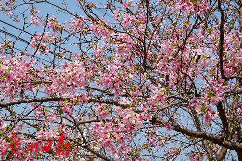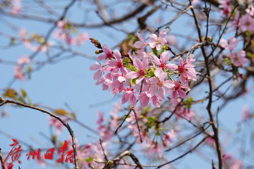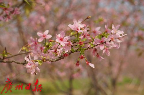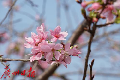 樱花园有7-8个品种的樱花,在春日里相继开放,如今正是广州樱的花期。据樱花悠乐园的相关负责人林琨介绍,樱花品种多,在广州的气候下,表现力最强的要数广州樱。广州樱花色为浅粉色,花期时花量多,花朵饱满。“如今陆续开放,观赏期预计能延续到三月份。”