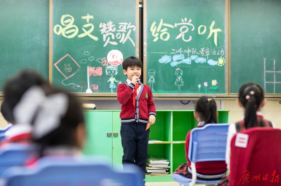 一段悠扬的乐声刚刚响起,朝天小学二年级港澳子弟班的小同学们就争先恐后地举起了手抢答:“唱支山歌给党听!”随后,他们跟着音乐动情地唱了起来:“唱支山歌给党听,我把党来比母亲……”嘹亮而又稚嫩的童声,传递了孩子们爱国爱党的情怀和志向。