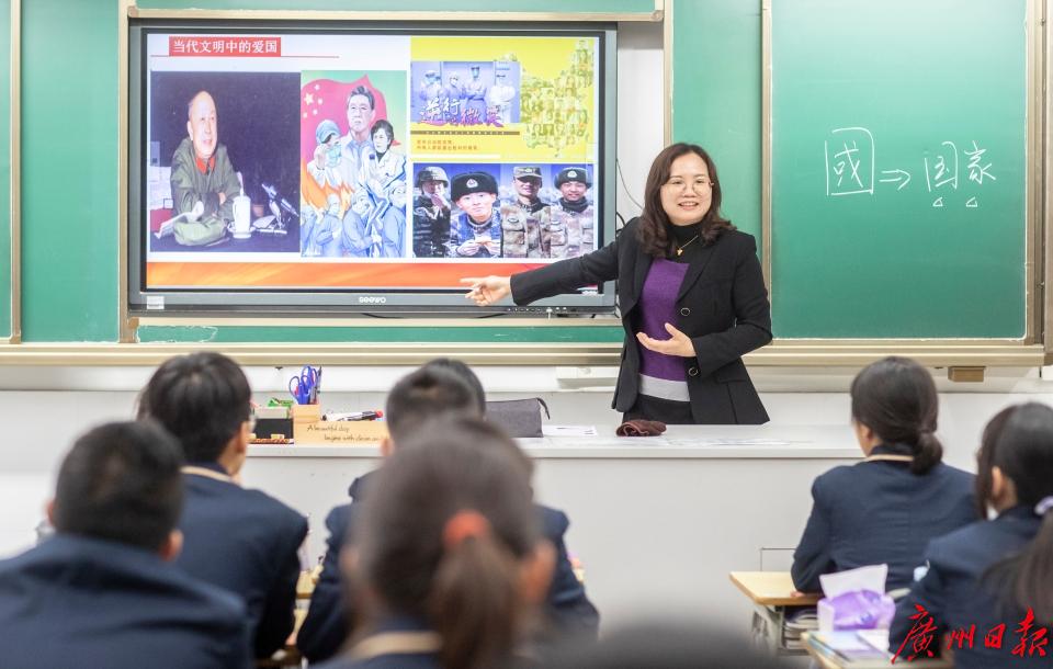 在广东华侨中学,高一年级港澳子弟班的同学们正在上一堂“同心共行,书写家国情怀”的思政课。“同学们,你们知道的爱国者都有谁?”“林则徐!”“戚继光!”“钱学森!”同学们纷纷答道。
