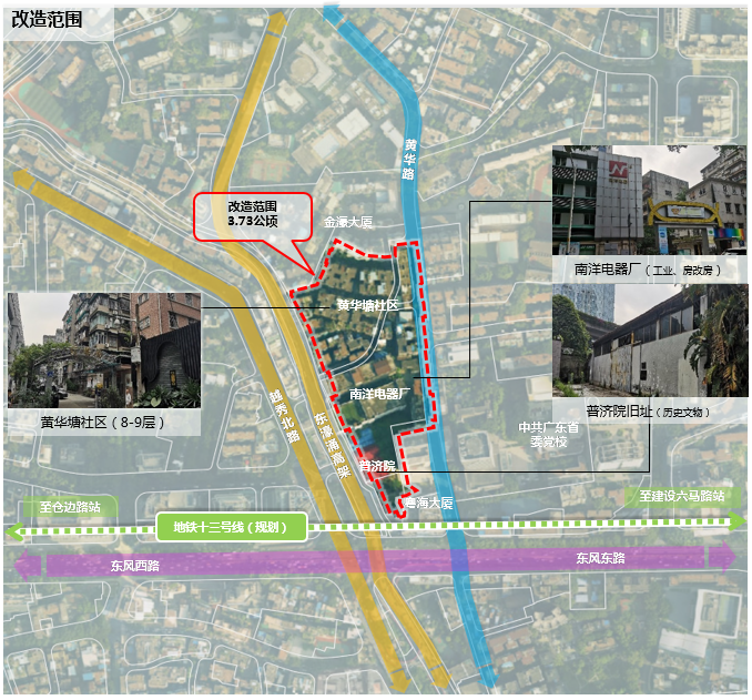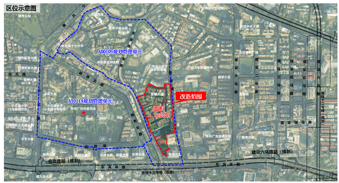 项目位于广州核心区越秀建设街黄金地段,东至黄华路,南至东风中路,西至东濠涌,北至金濠大厦。改造范围涉及约1310户住宅、厂房及商业,现状总建筑面积约11.1万平方米。此前已完成改造意愿表决工作,改造范围内同意改造的户数占比超过90%。并已完成控规调整,开发建设条件已经确定。