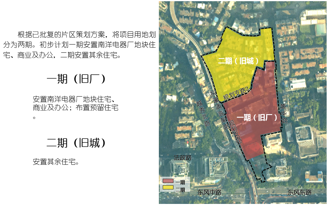 根据已批复的片区方案,将项目用地划分为两期。初步计划一期安置南洋电器厂地块住宅、商业及办公,二期安置其余住宅。实施后,将为越秀区核心地段带来宝贵的发展空间。