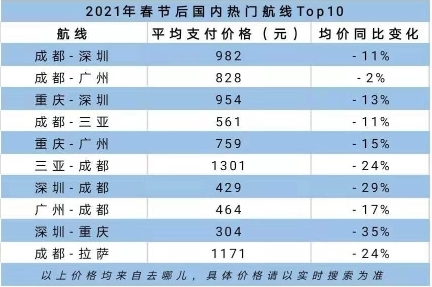去哪儿数据显示,截至元宵节(2月26日), 前十条国内热门航线的出发、到达城市都集中在南方,成都-深圳热度最高,平均支付价格为982元,与去年同期相比下降11%。
