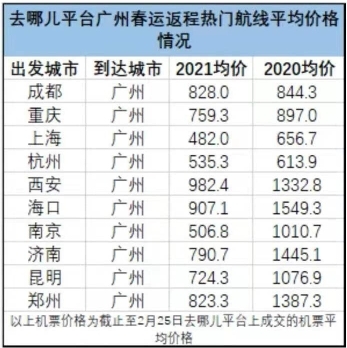 例如重庆至广州航线,平均支付价格同比去年下降15%左右。像西安至广州、南京至广州、济南至广州这样重要的春运返程航线,2021年的平均价格均低于去年。