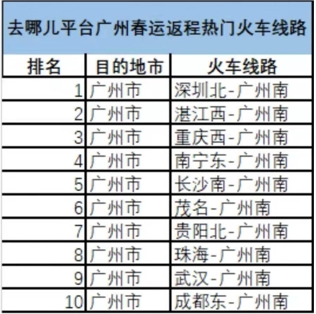 去哪儿平台上,作为重要的劳务输出地,重庆、南宁、长沙、贵阳、武汉、成都出发开往广州南的火车线路在春运返程热门线路中都名列前茅。全国范围内,从西南向华南的火车线路在节后最为繁忙。