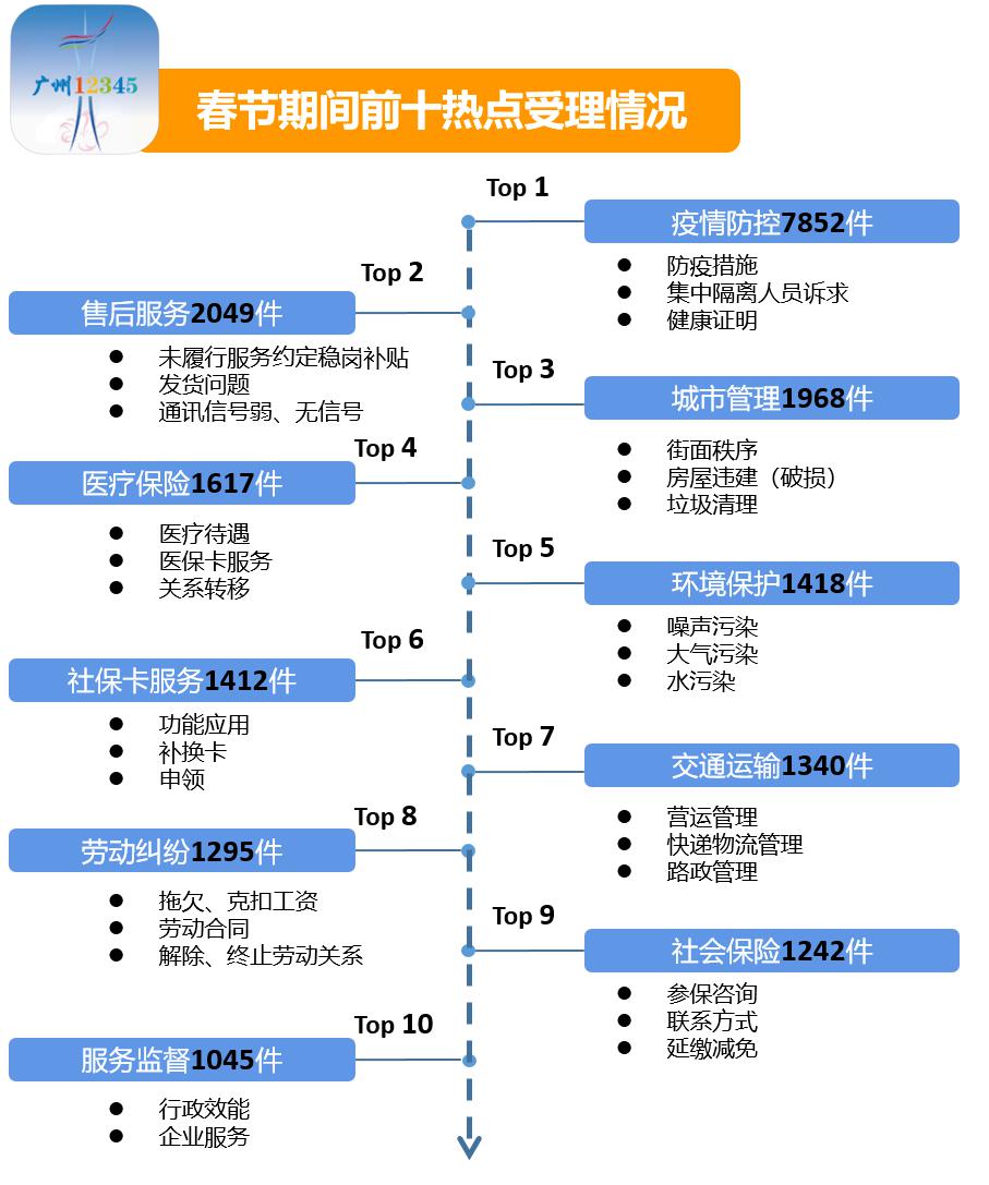 春节期间,热线实时汇总分析春节期间疫情防控、城市管理、交通出行、旅游消费维权、环境保护等诉求信息,每日内部通报热线重点、热点及突发类事项信息,为广州市做好春节期间民生保障工作提供热线数据预警及支撑。据了解,春节期间市民诉求主要集中在:疫情防控、售后服务、城市管理、医疗保险、环境保护、社保卡服务、交通运输、劳动纠纷、社会保险、服务监督等问题。