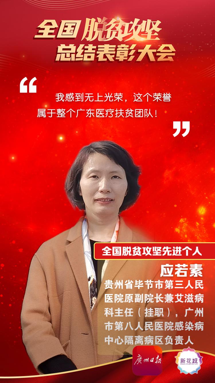 “作为一名党员,这次我能荣获全国脱贫攻坚先进个人,得到党和政府的认可,就是因为我在党组织的指引下,帮助毕节人民实现了‘健康脱贫’。我所做的工作就是艾滋病的防控,艾滋病人群是一个相对弱势的群体,是需要关照的一个群体,在这次扶贫中,广州市委市政府、广州市卫健委给予了非常大的投入和支持,竭尽所能地帮助毕节,充分体现了我们党一贯的‘人民至上’的理念。”应若素表示,作为市八医院的一名医务人员,她将继续做好医疗服务,积极为乡村医疗工作做贡献。