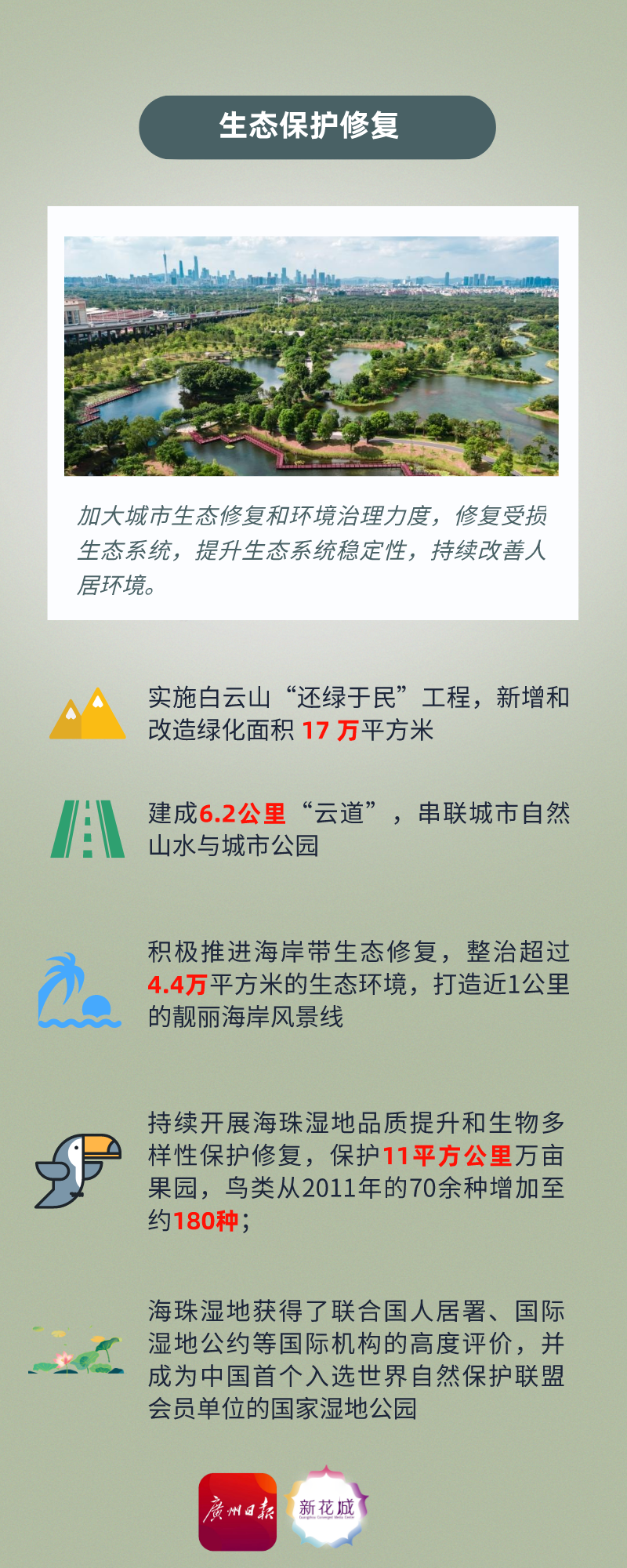 在生态保护修复方面,加大城市生态修复和环境治理力度,修复受损生态系统,提升生态系统稳定性,持续改善人居环境。实施白云山“还绿于民”工程,通过拆除违建及环境整治进行生态修复,完成复绿面积超过10万平方米,新增和改造绿化面积 17 万平方米。建成6.2公里“云道”,串联城市自然山水与城市公园,以“低干扰轻介入”的方式打造可游可赏可玩的空中步径,为市民提供更多、更优的绿色空间。积极推进海岸带生态修复,实施南沙区虎门大桥北侧海岸线整治示范工程,通过沙滩换沙修复、堤防绿化、红树林种植等方式,整治超过4.4万平方米的生态环境,将受到侵蚀的海岸修复成为兼具生态与游赏价值的滨海公园,打造近1公里的靓丽海岸风景线。持续开展海珠湿地品质提升和生物多样性保护修复,保护11平方公里万亩果园,恢复垛基果林湿地风貌,修复感潮河网,营造良好动植物生境,为大量珍稀鸟类提供重要的觅食停歇地和栖息繁衍地,鸟类从2011年的70余种增加至约180种;海珠湿地获得了联合国人居署、国际湿地公约等国际机构的高度评价,并成为中国首个入选世界自然保护联盟会员单位的国家湿地公园。