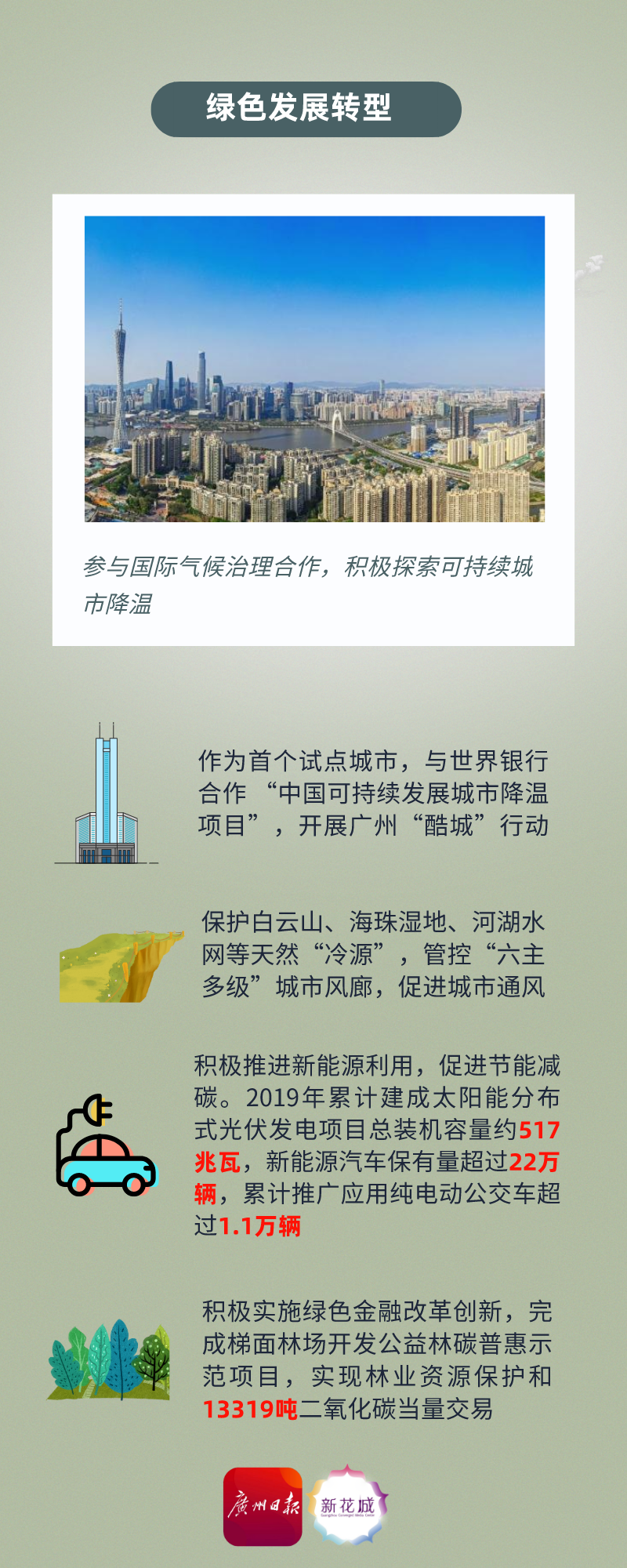 在绿色发展转型方面,参与国际气候治理合作,积极探索可持续城市降温。作为首个试点城市,与世界银行合作 “中国可持续发展城市降温项目”,开展广州“酷城”行动,推进永庆坊二期旧城更新提升、中新知识城绿色生态低碳新区建设以及海珠湿地绿色基础设施降温效益评估等示范项目。保护白云山、海珠湿地、河湖水网等天然“冷源”,管控“六主多级”城市风廊,促进城市通风。研究制定实用型城市降温技术和综合政策行动框架,提升城市气候舒适度。积极推进新能源利用,促进节能减碳。2019年累计建成太阳能分布式光伏发电项目总装机容量约517兆瓦,新能源汽车保有量超过22万辆,累计推广应用纯电动公交车超过1.1万辆,纯电动公交车应用规模位居全球城市前列,荣获世界C40城市绿色科技奖。积极实施绿色金融改革创新,依托广东省碳排放权交易市场和碳普惠制试点,以花都区为核心建设广州市绿色金融改革创新试验区,完成梯面林场开发公益林碳普惠示范项目,实现林业资源保护和13319吨二氧化碳当量交易。