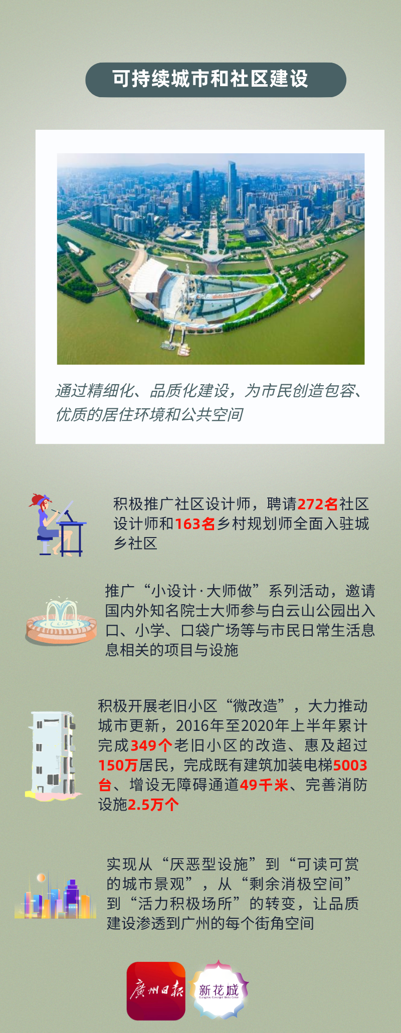 在可持续城市和社区建设方面,通过精细化、品质化建设,为市民创造包容、优质的居住环境和公共空间。积极推广社区设计师,聘请272名社区设计师和163名乡村规划师全面入驻城乡社区;推广“小设计·大师做”系列活动,邀请国内外知名院士大师参与白云山公园出入口、小学、口袋广场、人行桥、公共厕所、变电站等与市民日常生活息息相关的项目与设施,激活城市活力。在天河猎德大桥试点开展桥下空间微改造。积极开展老旧小区“微改造”,大力推动城市更新,2016年至2020年上半年累计完成349个老旧小区的改造、惠及超过150万居民,完成既有建筑加装电梯5003台、增设无障碍通道49千米、完善消防设施2.5万个,有效提升老旧小区的环境品质。实现从“厌恶型设施”到“可读可赏的城市景观”,从“剩余消极空间”到“活力积极场所”的转变,让品质建设渗透到广州的每个街角空间。