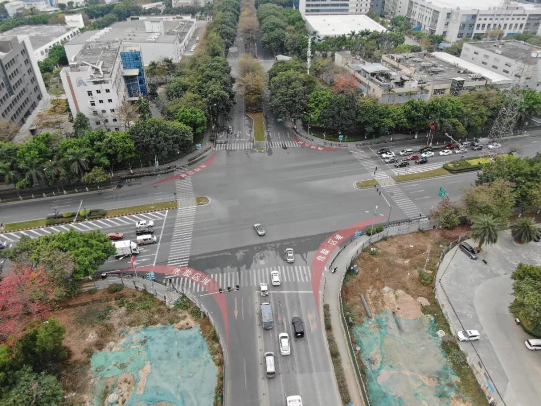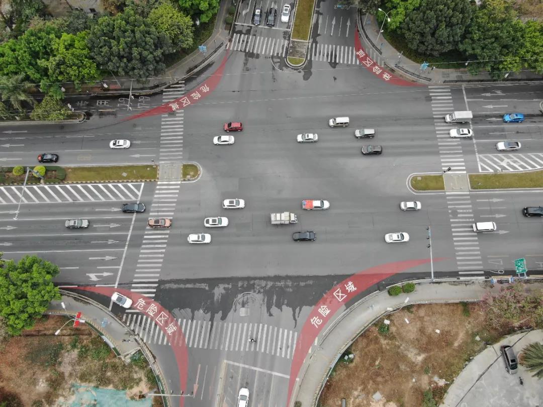 为了减少因此产生的交通事故,黄埔交警大队联合区建设和交通局针对开创大道与骏功路十字路口周边货运物流、工业企业集中,大型货车占比较高,高峰期间行人过街需求大的特点,在各向右转区域铺装红色沥青,同时地面施划“危险区域”字样,将盲区变成一个醒目的区域。
