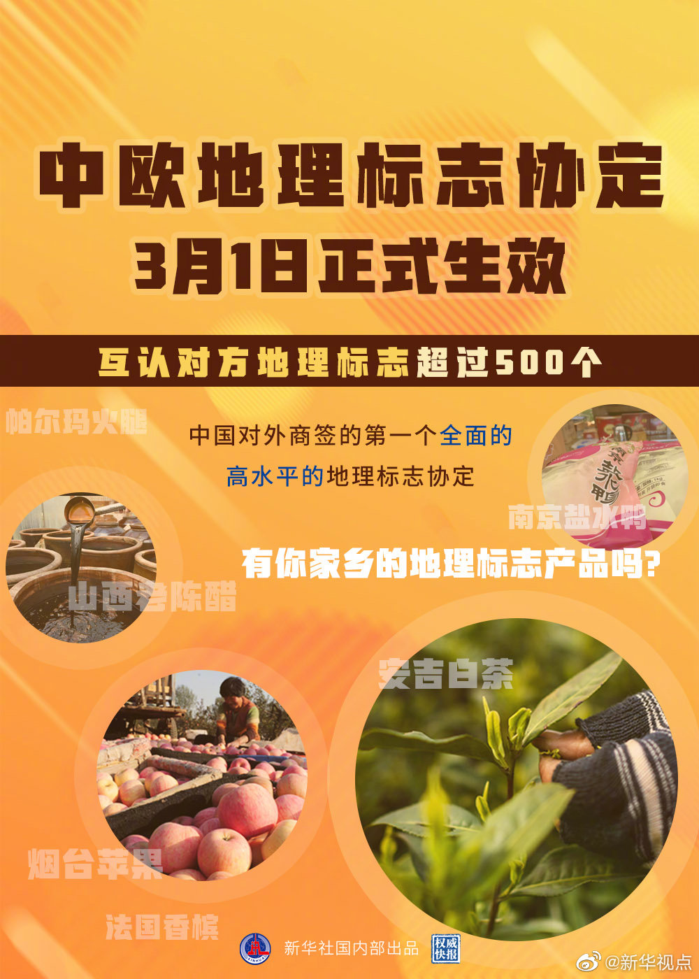 地理标志是识别产品来源于某一地区的标志,而该产品的质量和声誉都取决于这一特定地区的自然和人文因素,比如我国的“普洱茶”或欧盟的“香槟”。中国和欧盟的地理标志资源都很丰富。为加强地理标志保护与合作,促进地理标志产品贸易,双方于2011年启动了中欧地理标志协定谈判,谈判共历经8年22轮正式谈判和上百次非正式磋商。2020年9月14日,双方正式签署协定。2021年1月29日,双方完成内部审批程序并相互通知。2021年3月1日,协定正式生效。