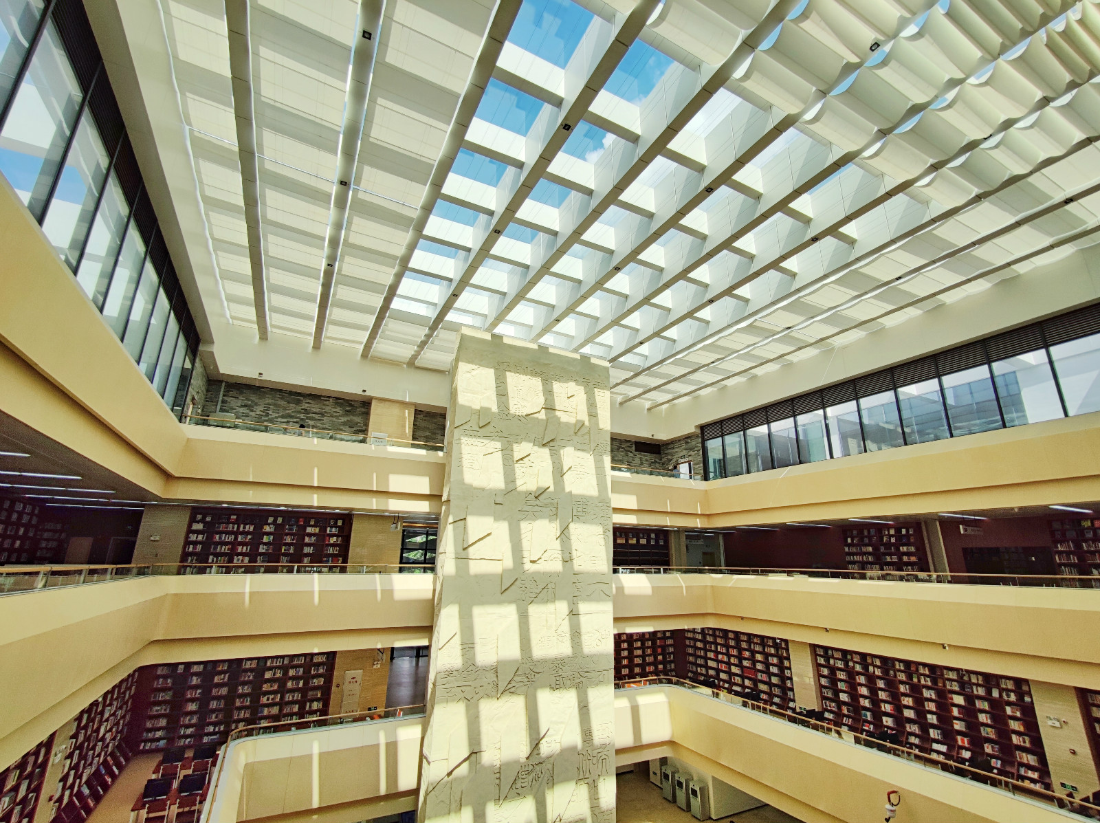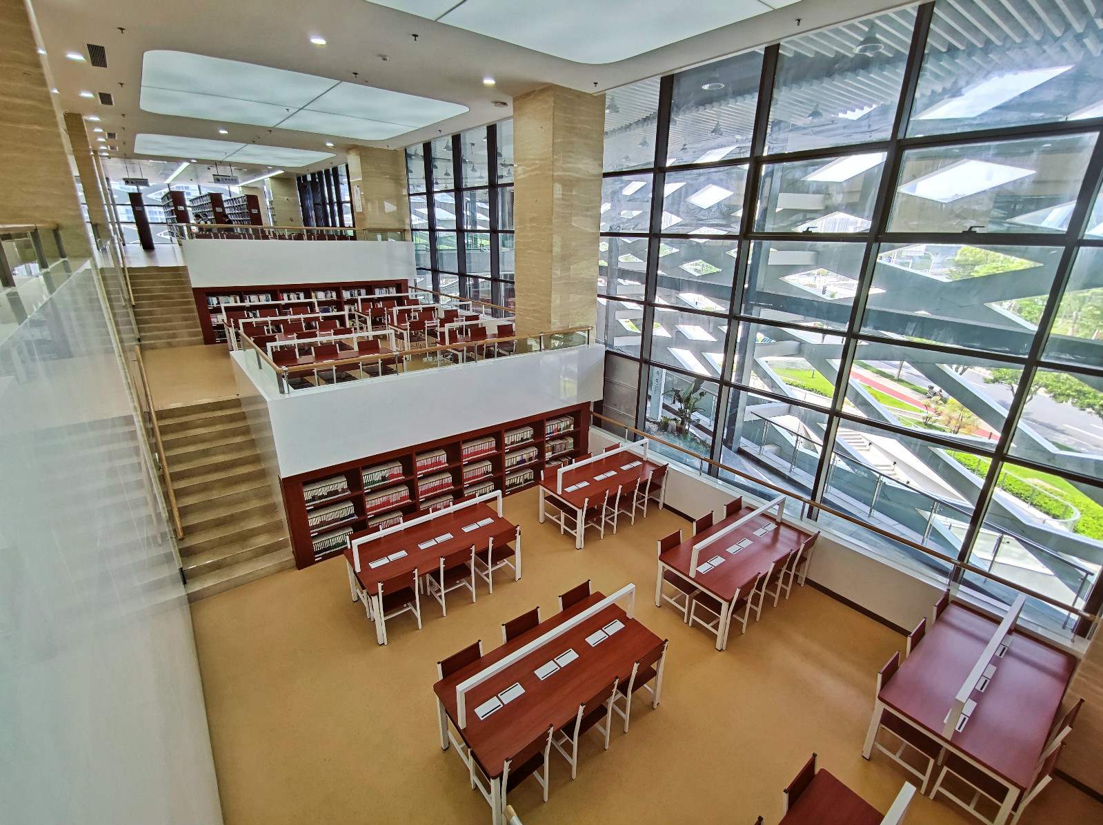 书山外文馆:建筑造型呈阶梯状分布,主要包括外文原版图书阅览区和读者活动区。层层向上的阶梯,营造出“书山”的意境,突显“书山有路勤为径”的设计理念。馆藏约有3万册外文原版国书,主要满足区内外籍人士和中文读者对外文图书的阅读需求。