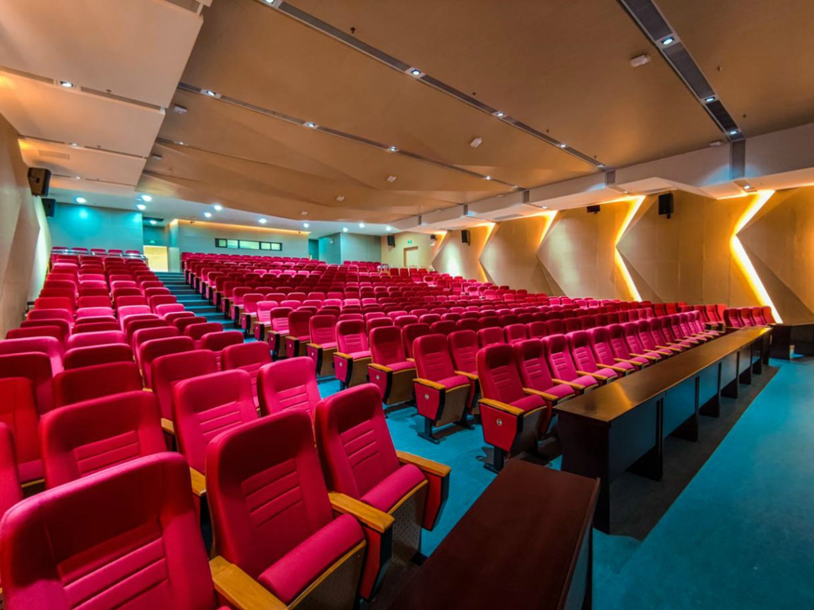 报告厅:可容纳418人,以折纸造型体现空间层次变化和节奏美感,现代不失个性,既丰富了空间灯光效果,也符合声学要求。