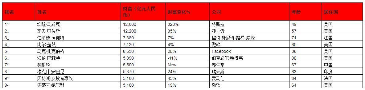 根据榜单,前十名中有三张新面孔:埃隆·马斯克、钟睒睒和贝特朗·皮埃奇。前十名企业家总财富比去年增长9%,达到7.3万亿元人民币,占全榜单总财富的7.5%。六人来自美国,两人来自法国,中国第一次有人进入全球企业家前十名。前十名企业家财富平均涨幅超过50%。
