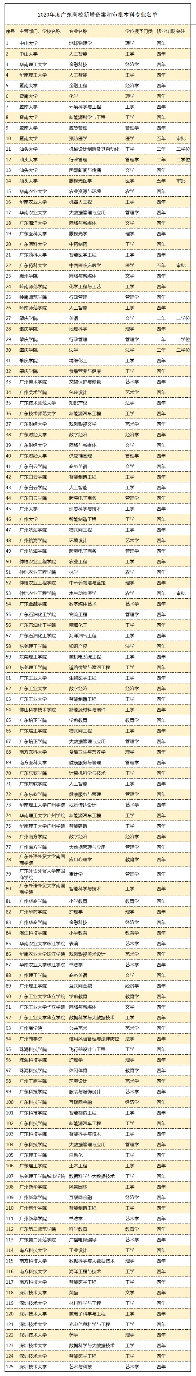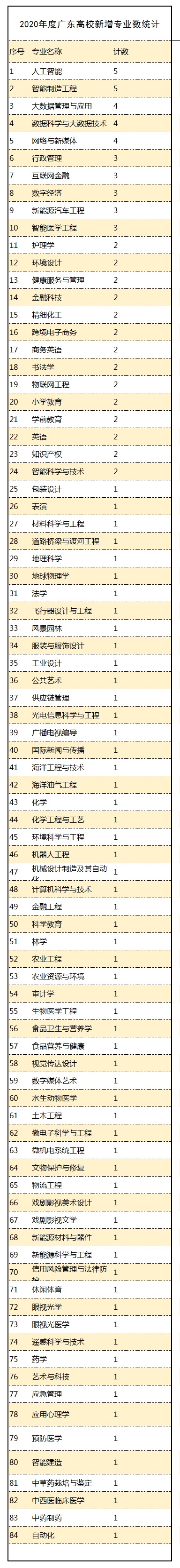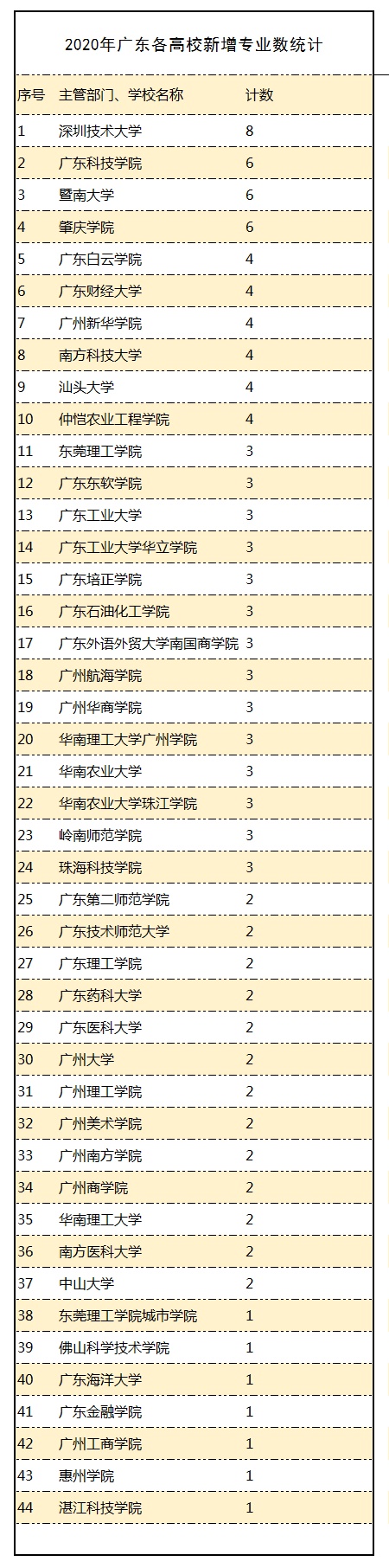 此外,广东科技学院、暨南大学、肇庆学院新增专业均为6个,广东白云学院、广东财经大学、广州新华学院、南方科技大学、汕头大学、仲恺农业工程学院新增4个专业。