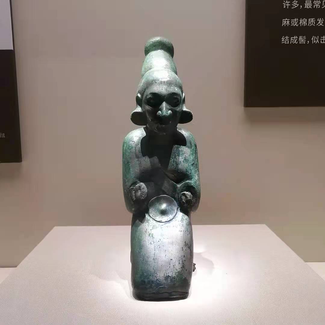 比如在日常装扮方面,馆方专家告诉我们,滇国女子发型变化较多,有梳椎髻者,如“银锭髻”“马鞍髻”等,也有的自由垂放,不加梳理,还有的挽成螺旋形状,盘在头顶正中,另有的束于颈侧,或结于脑后,种种不一;滇国男子的装饰相对就简单许多。最常见的发型为圆髻,先以丝、麻或棉质发带束发于头顶,然后打结成髻,状似击鼓之木棰。滇人男女都头插发簪,佩耳环,颈戴珠串,佩戴臂钏、手镯、扣饰等,有的还文身,头插雉鸡的尾羽和牙角等装饰品。女子多带有精美的耳铛,再加上绿松石、玛瑙等作的首饰,金玉制作的手镯、臂钏,更加华美。