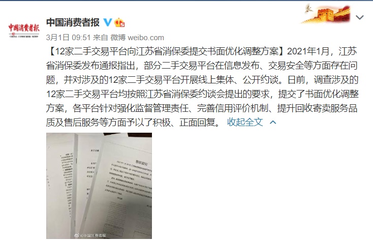 【12家二手交易平台向江苏省消保委提交书面优化调整方案】2021年1月,江苏省消保委发布通报指出,部分二手交易平台在信息发布、交易安全等方面存在问题,并对涉及的12家二手交易平台开展线上集体、公开约谈。日前,调查涉及的12家二手交易平台均按照江苏省消保委约谈会提出的要求,提交了书面优化调整方案,各平台针对强化监督管理责任、完善信用评价机制、提升回收寄卖服务品质及售后服务等方面予以了积极、正面回复。