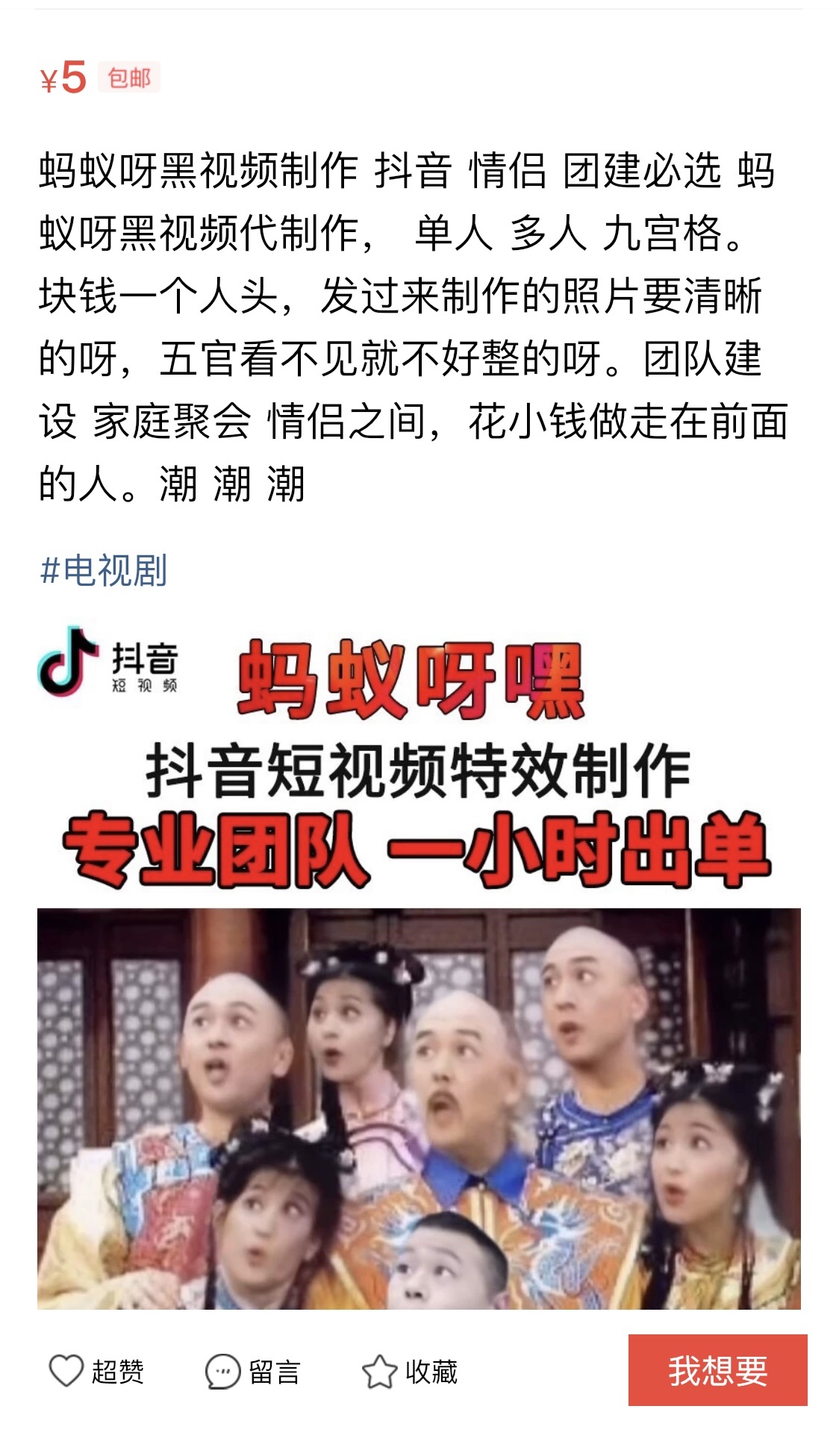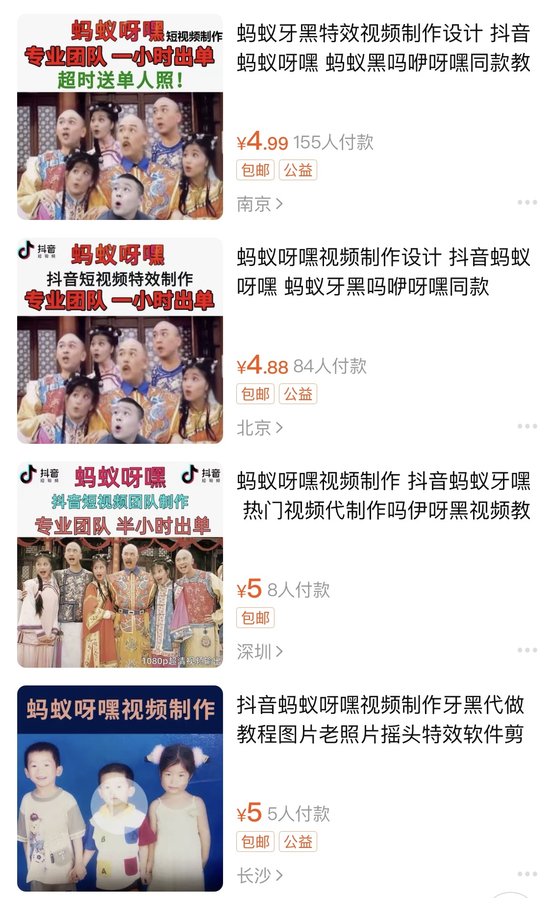 因为有的制作软件只能在苹果手机上下载,涉及到多人照片的制作还需一定的视频剪辑能力,所以很多公司赶紧跟风开发了操作简便的类似软件,可“一键生成”这款视频。在短视频平台上,不仅有很多关于如何制作该类视频的教程,甚至在淘宝、咸鱼等电商平台上,还出现了“蚂蚁呀嘿”视频代制作的业务,价格根据需要制作的人头数从1元到几十元不等,吸引了不少顾客。