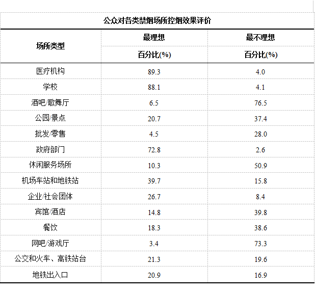 《报告》显示,最理想的前三类依次是医疗机构(89.3%)、学校(88.1%)和政府部门(72.8%);最不理想的三类场所依次是酒吧/歌舞厅(76.5%)、网吧/游艺厅(73.3%)和休闲服务场所(50.9%)。
