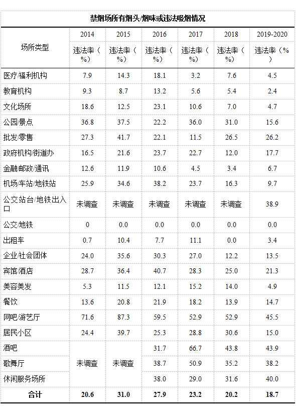 在场所吸烟情况部分,本次调查显示场所有烟头、烟味或违法吸烟情况为18.7%,为历年来最低。