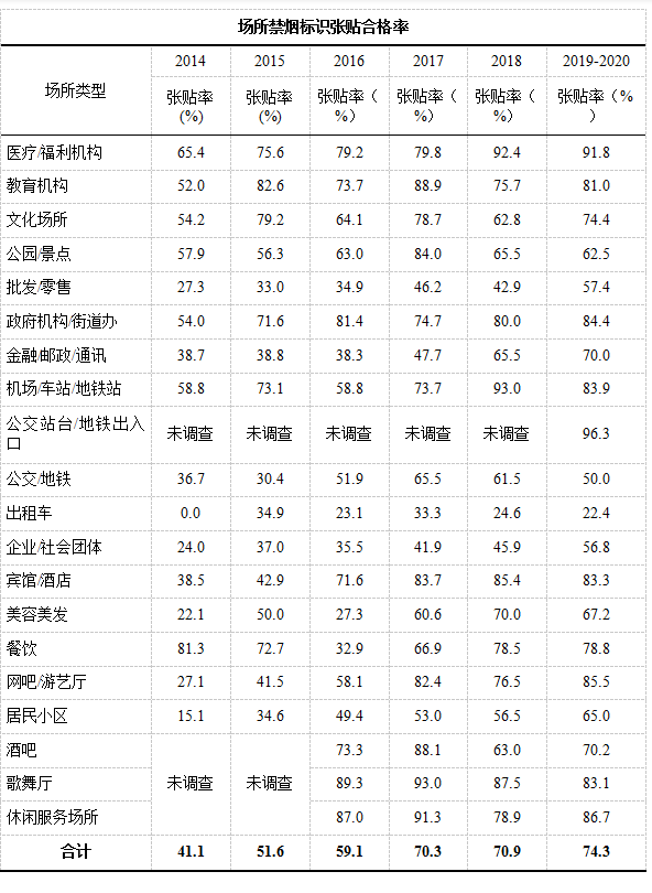 此外,在本次调查的1335个场所中,禁烟标识总合格率为74.3%。其中机场/车站/地铁站的合格率最高为96.3%,其次是医疗/福利机构(91.8%)、休闲服务场所(86.7%);出租车的禁烟标识合格率最低,仅为22.4%;此外,公交/地铁、批发/零售、企业/社会团体禁烟标识张贴合格率均未达到60%。2014-2020年,整体禁烟标识合格率呈上升趋势;但与2018年相比,不少场所禁烟标识张贴合格率有所下降。