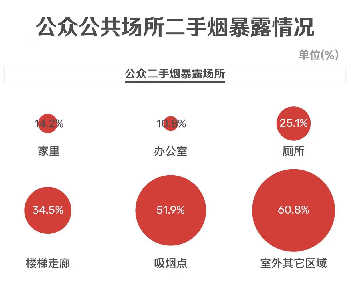 《报告》显示,79.3%的公众认为控烟条例实施以来,二手烟暴露明显减少或有所减少。目前公众二手烟暴露区域主要为非禁烟的室外区域、吸烟点、楼梯间和厕所,分别达到60.8%、51.9%、34.5%、25.1%。