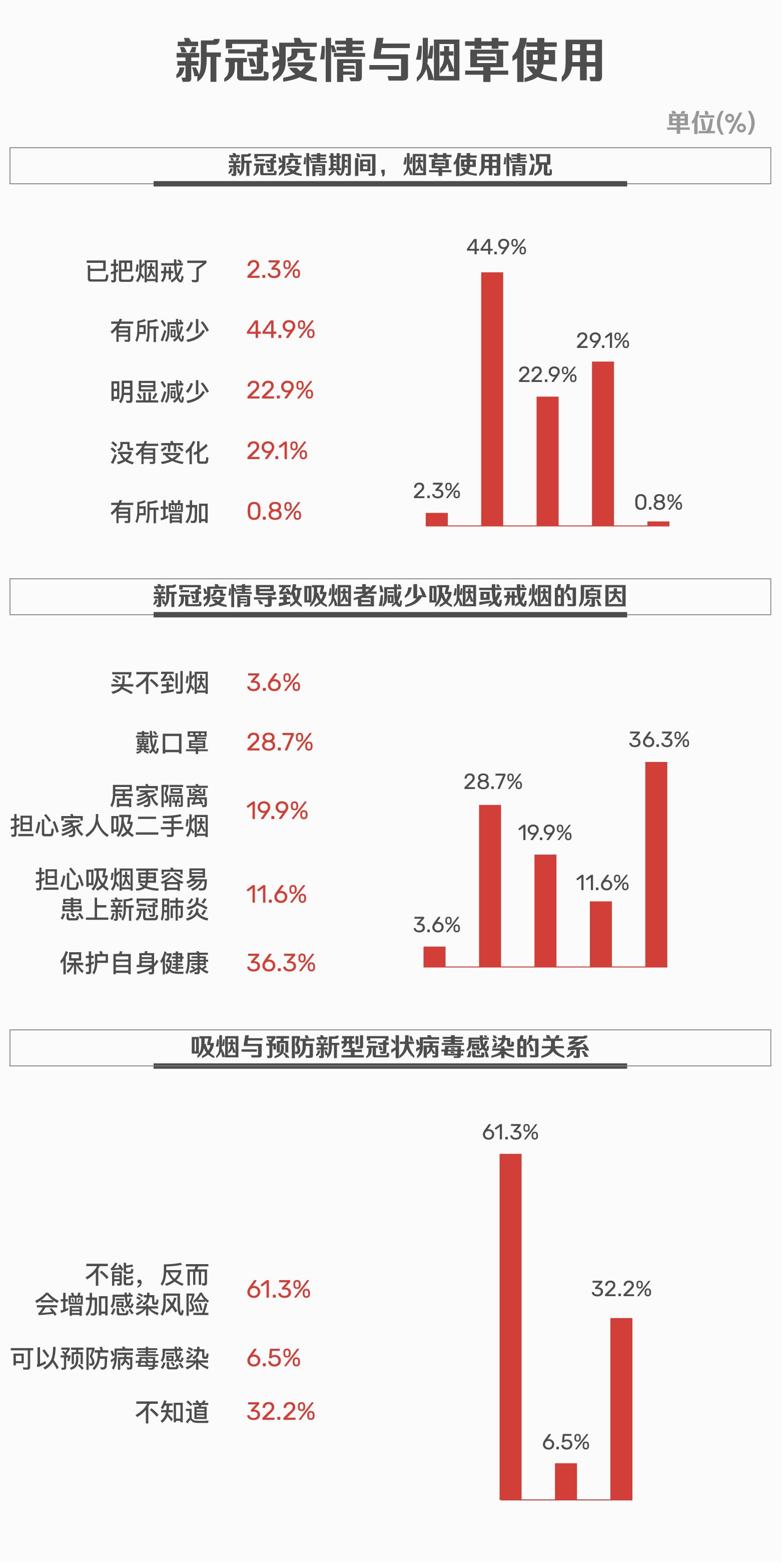 《报告》显示,新冠肺炎疫情期间,67.8%的吸烟者吸烟量减少,2.3%的吸烟者戒烟,其戒烟或减少吸烟的原因排名前三位的是保护自身健康(36.2%)、戴口罩(28.7%)、居家隔离担心家人吸二手烟(19.9%)。61.3%的吸烟者认为吸烟并不能预防新型冠状病毒感染,反而增加感染风险。