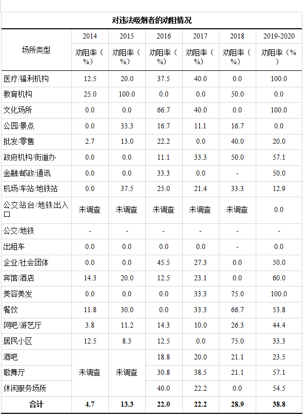 此外,在对违法吸烟者劝阻方面,本次调查发现,违法吸烟者被劝阻的比例为38.8%。与2018年相比,劝阻的比例大幅上升。