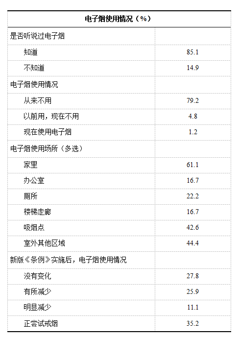 调查发现,83.0%的受访者知道电子烟已纳入禁烟范围,85.1%的受访者听说过电子烟,1.2%的受访者正在使用电子烟,电子烟使用场所排名前三位的分别是家里、室外其他区域、吸烟点,此外,72.2%的现在电子烟使用者减少或尝试戒烟。