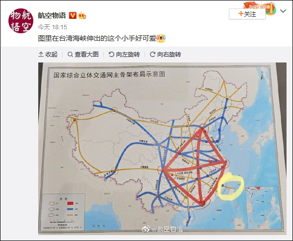 知名航空博主@航空物语 随后更是在这张图上标注出了从大陆通向台北的交通线路,并配文写道:“图里在台湾海峡伸出的这个小手好可爱。”