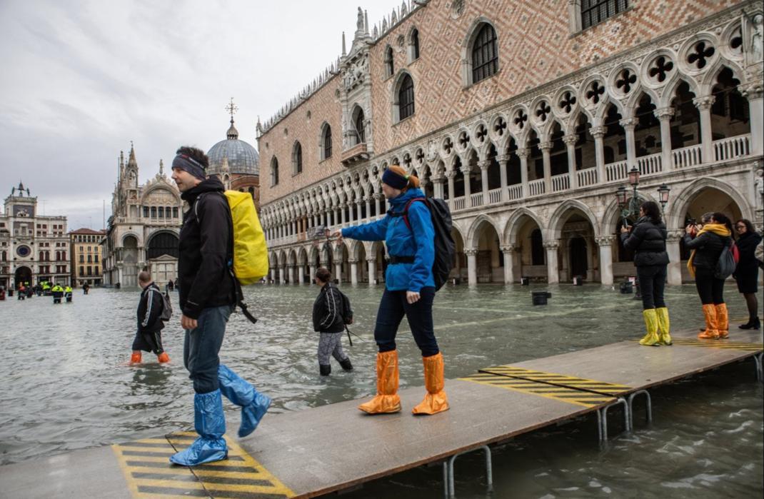 2019年威尼斯洪水时人们在木桥上行走