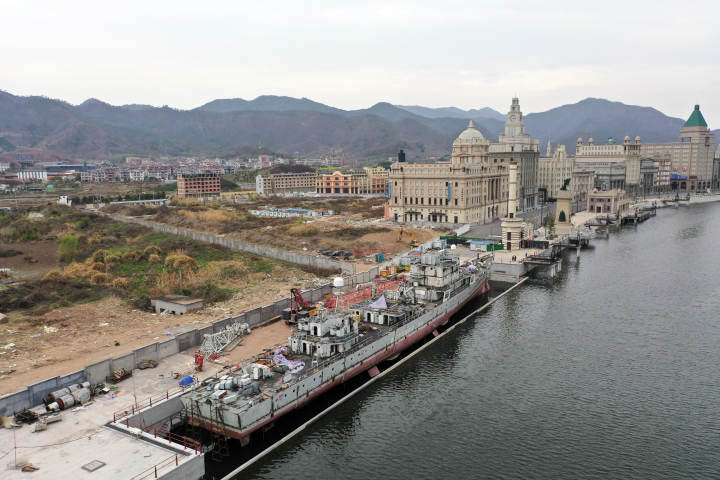 记者了解到,“金华舰”从海南被拖回舟山,并由半岛船厂负责拆解成5000多个零部件运回横店进行拼装。为保证舰体安全,横店影视城还专门建立一个面积达1700多平方米的船坞码头,并用钢铁支架将舰体固定在船坞底部。