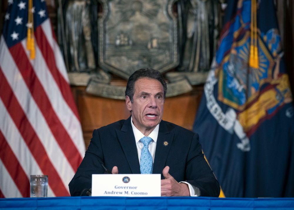 2020年5月15日,美国纽约州州长科莫在纽约州首府奥尔巴尼出席新闻发布会。(新华社发,纽约州州长办公室供图)