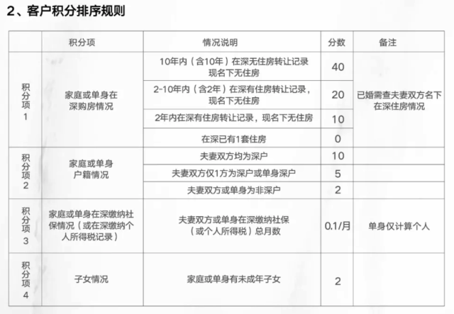 积分方面,具体来看,深圳家庭或单身在深购房情况中:10年内(含10年)在深无住房转让记录,现名下无住房,积40分;2-10年内(含2年)在深有住房转让记录,现名下无住房,积20分;2年内在深有住房转让记录,现名下无房,积10分;而在深已有1套住房,积0分。